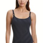 Bañador con copa interior. El escote es redondo tipo camiseta para realzar el busto.