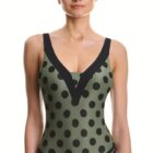 estilizar el cuello. El bañador lleva unas piezas a contraste en negro, en el escote,