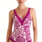 El bañador lleva unas piezas a contraste en el escote, espalda y piernas, afinando las caderas y creando un efecto moldeador de la figura.