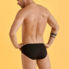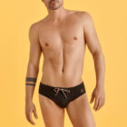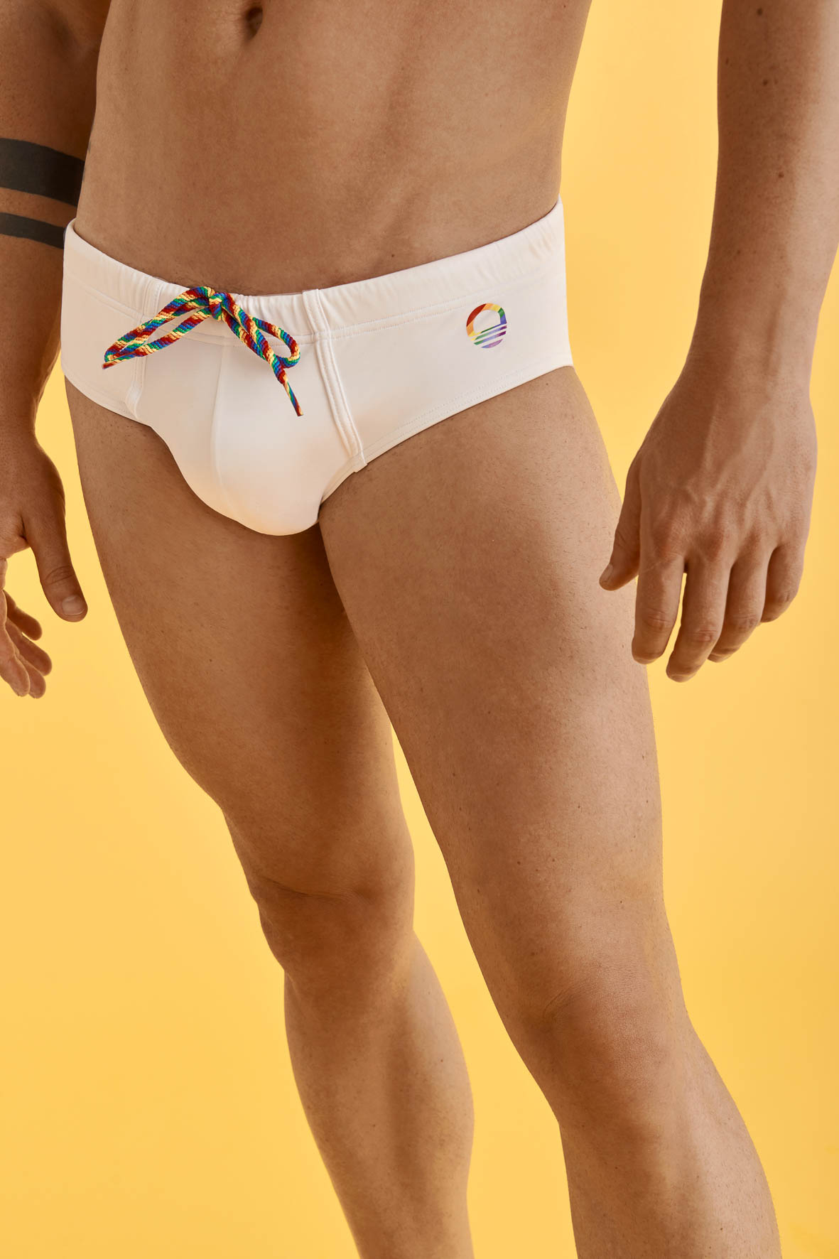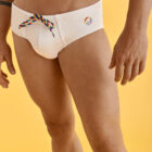 Bañador slip en color blanco o negro con cordones y logo en colores pride. Cinturilla elástica con cordón ajustable.