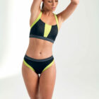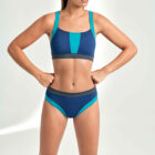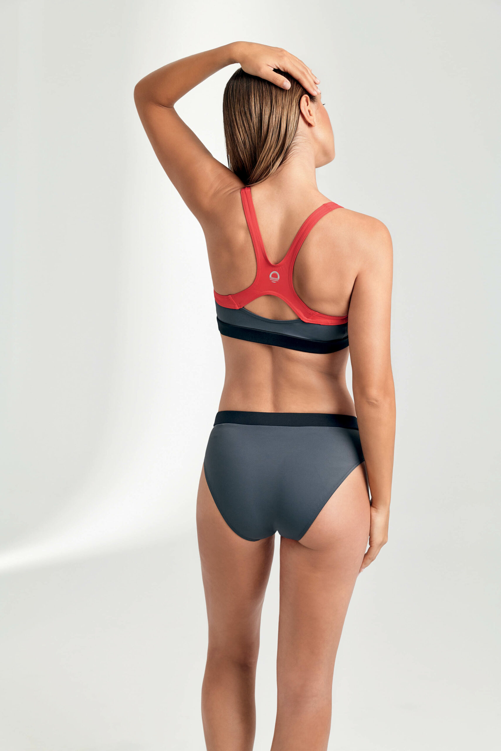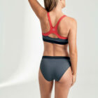 Bikini deportivo. Espalda ergonómica con pequeña abertura. Tirantes anchos para mayor sujeción y libertad de movimientos. Sujeción media.