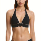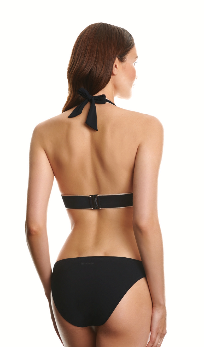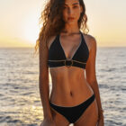 Este bikini pertenece a la colección extralife sensitive en color negro con vivo a contraste en beige y aplicación dorada mate.