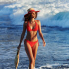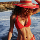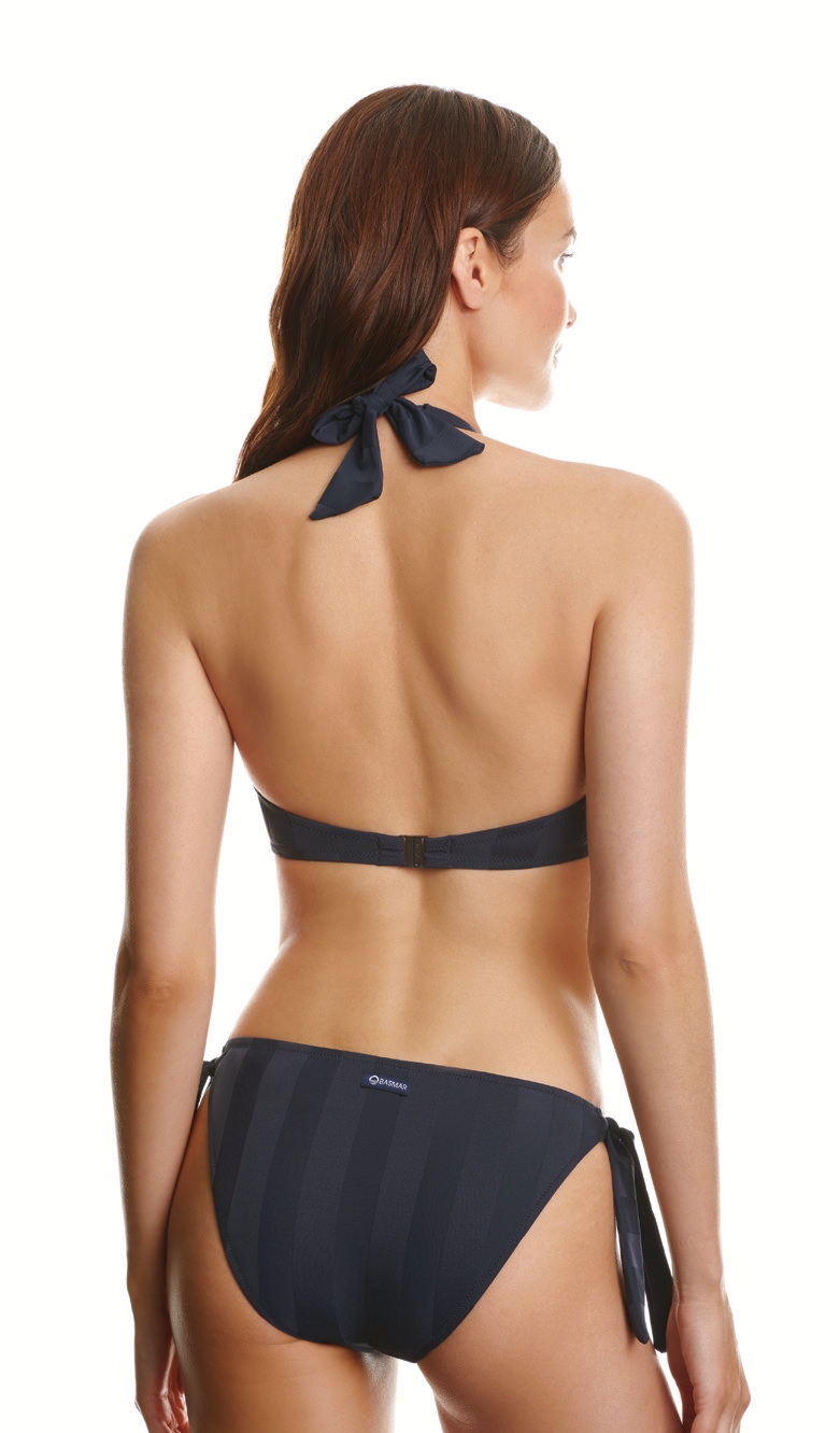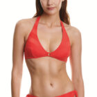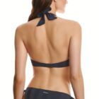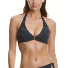 Bikini halter con copas triangulares interiores de capacidad C, atado al cuello.
