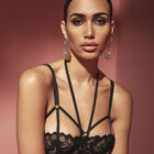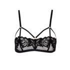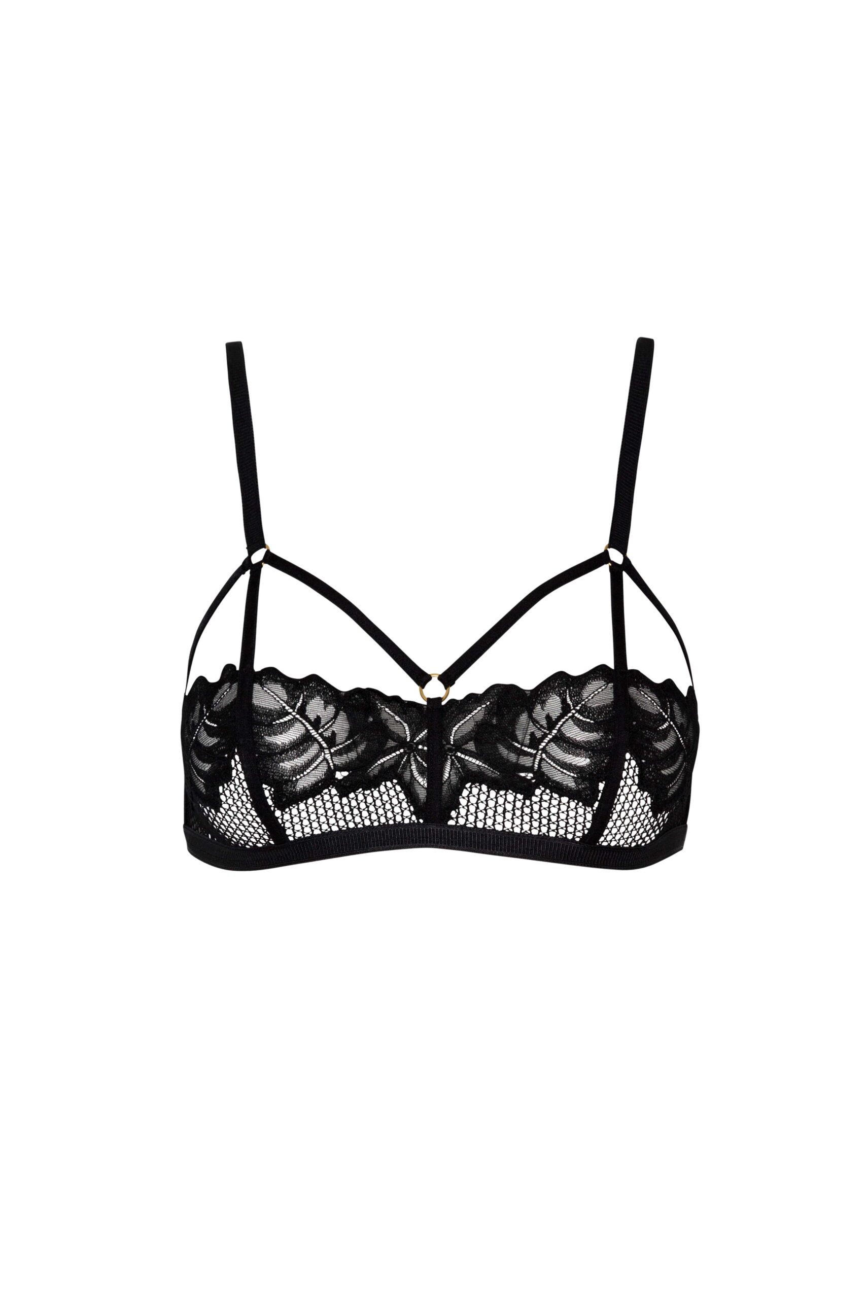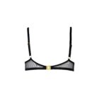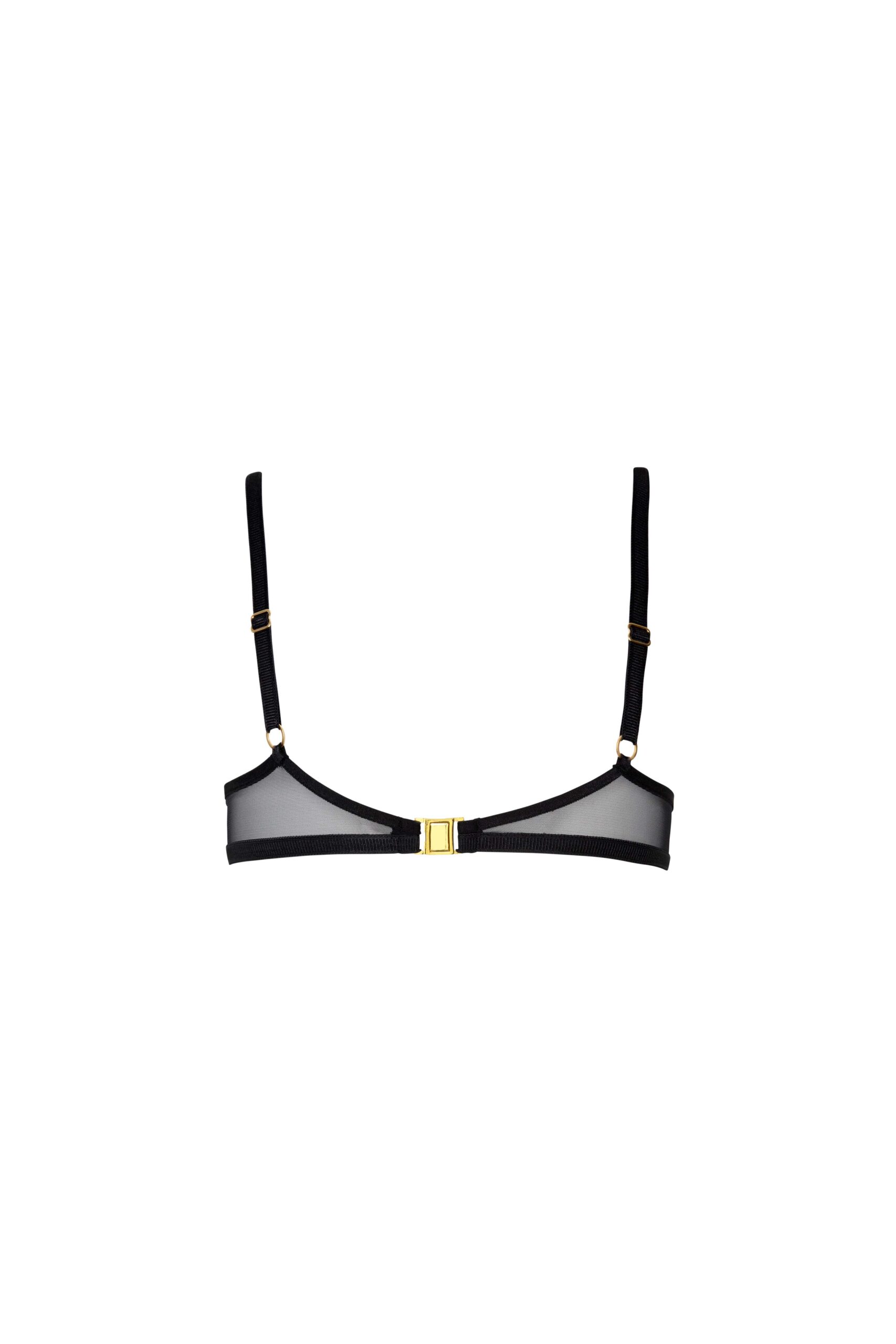 Sujetador fabricado con encaje de Leavers, tul, tiras elásticas satinadas y apliques en dorado. Tiene un diseño sugerente al dejar partes del pecho al descubierto.