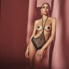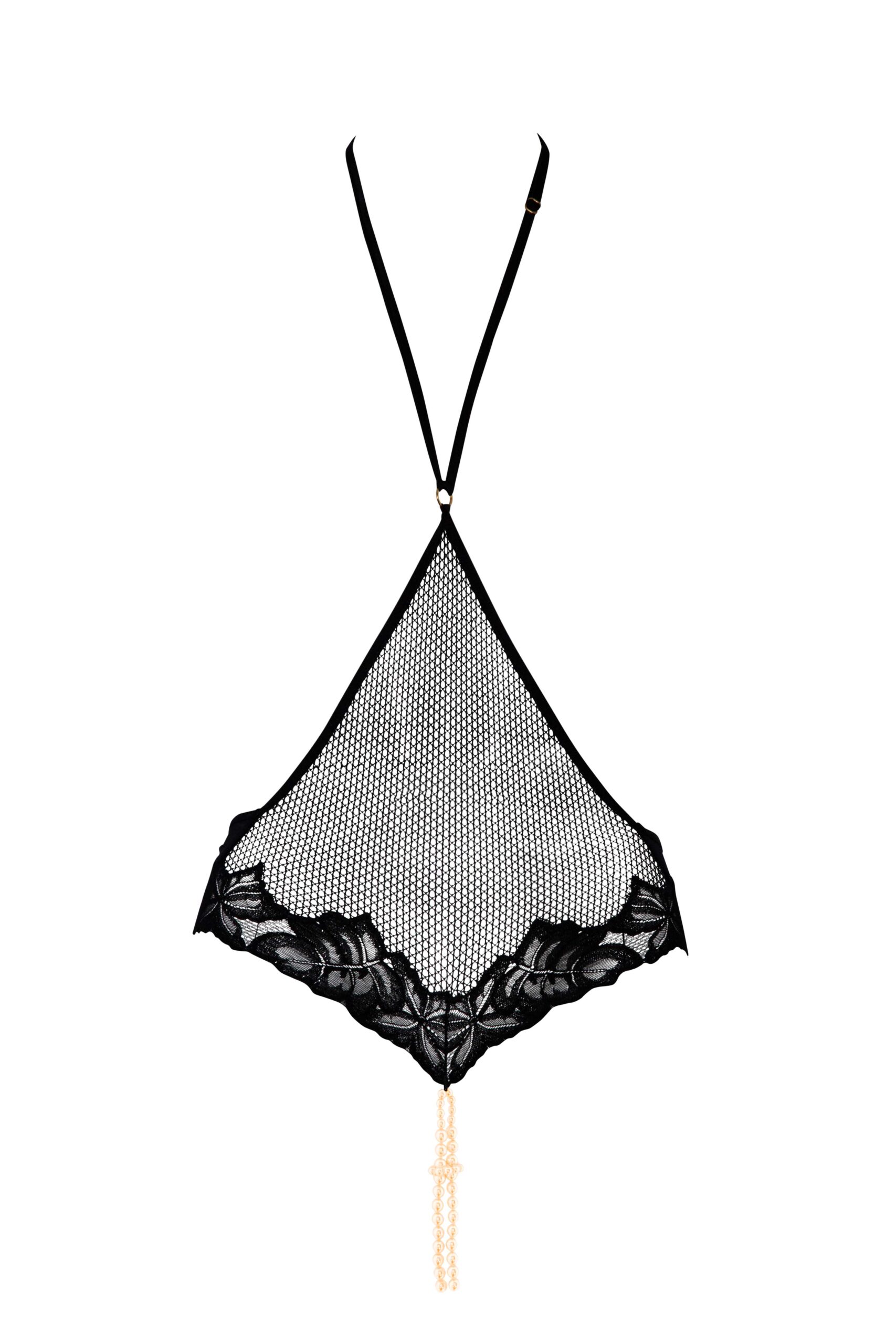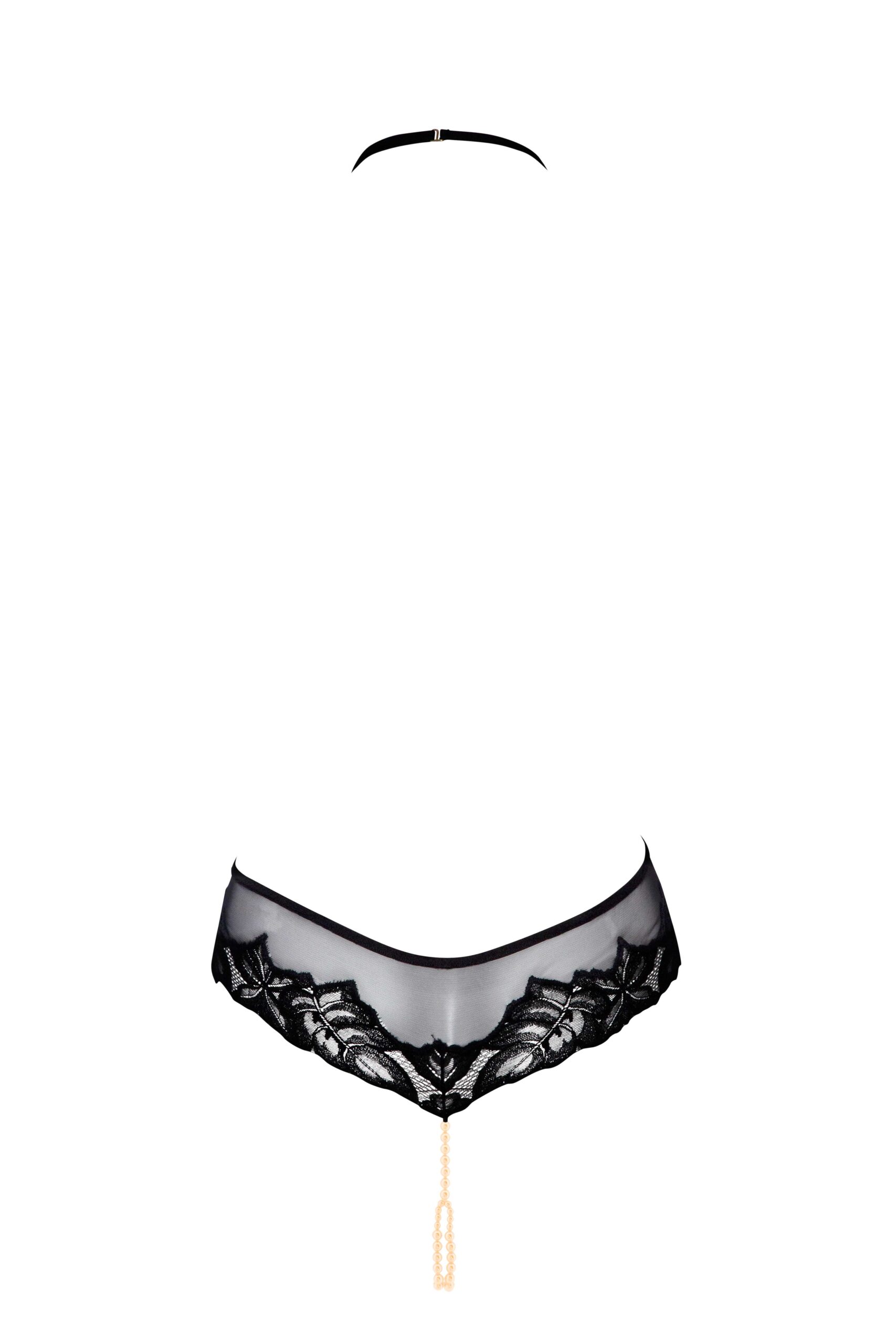 Playsuit fabricado con encaje de Leavers, tul y apliques en dorado. Diseño sencillo pero picante al dejar los pechos totalmente al descubierto. Perfecto para pasar una noche diferente. El sello de BRACLI lo pone el collar doble de perlas, con el que se pueden conseguir dos tipos de sensaciones: estimulación de la zona genital de la mujer y de ambos miembros de la pareja en una relación sexual.