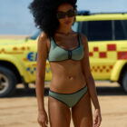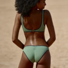 Bikini que combina el liso kaki con los vivos a contraste en negro, detalle cremallera en el escote.