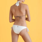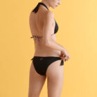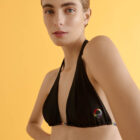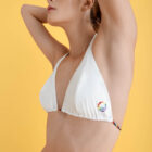 Top de bikini cortina sin relleno y sin aro. Tirantes al cuello y o espalda. Atado a la espalda con espagueti con los colores pride. Liso en blanco o negro con logo en colores pride.