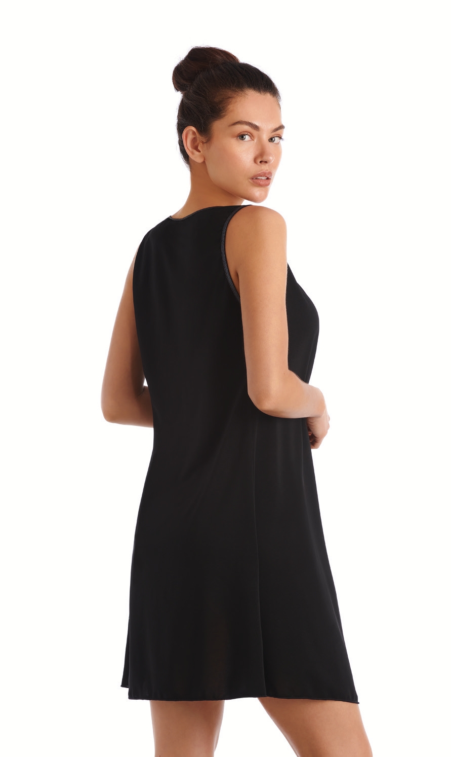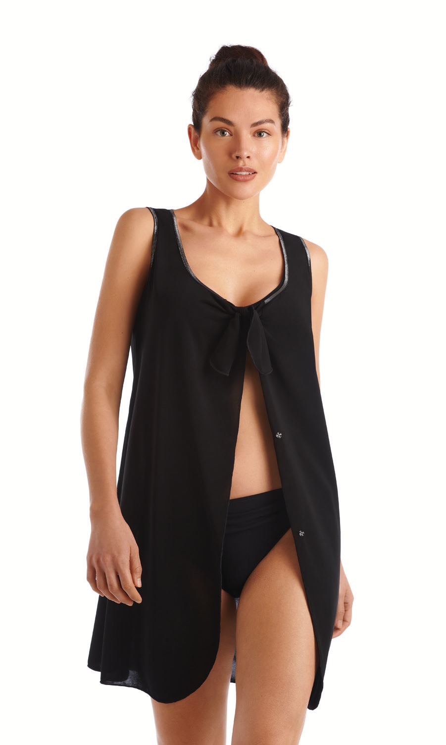 Vestido sin mangas, abierto, anudado en el escote y con vivo efecto lúrex.