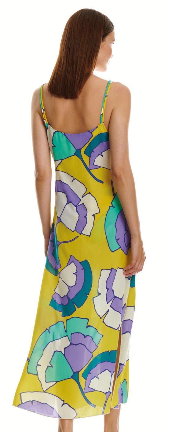 Vestido largo hasta los tobillos y con cortes en los laterales. El escote es con